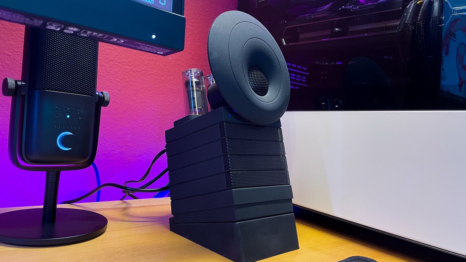 The unique thing about the HumanCentric speakers is that they have built in tweeters that push highs up to 28kHz, according to the company. The preamp is integrated into the design through two exposed vacuum tubes. While these no doubt look unique, they’re hidden behind the oversized dome tweeters I believe HumanCentric calls HyperFocus. I won’t pretend to understand the full benefits of the science behind how these benefit mechanically, but I will say that at least from an aesthetic standpoint, the look of these desktop speakers rock.