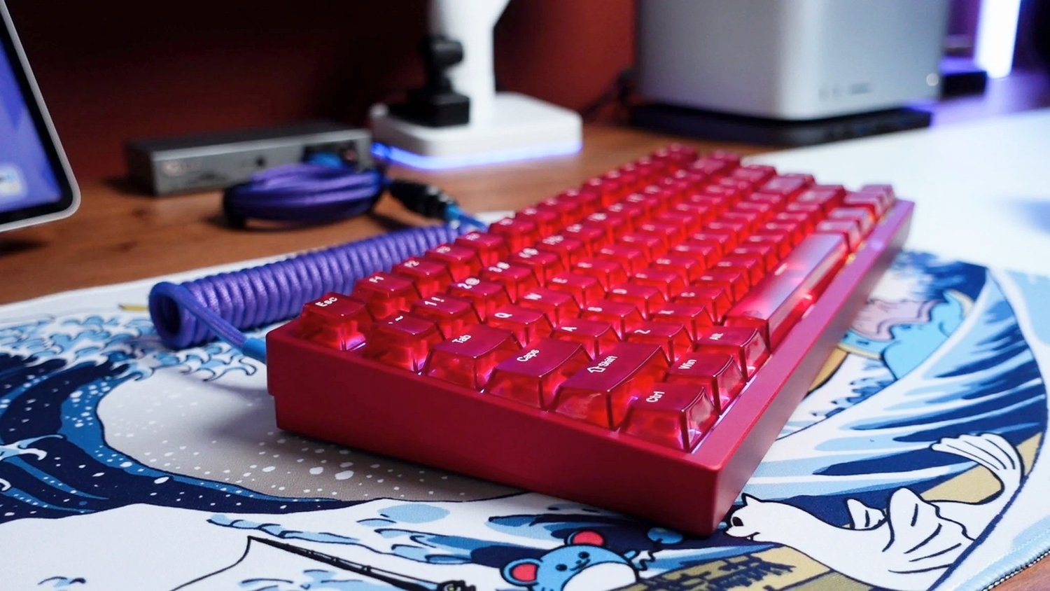 With 81 keys, IROK throws on a pretty standard 75% keyboard layout here. Print Screen and a Delete key squeeze into the top right corner, with Insert, Page Up, and Page Down dropping down a column below. Other than the directional keys tetris-ed under the Enter and Shift keys, it otherwise is in the body of a 65% board with the way everything is neatly compacted together. It’s a tidy layout, but it is missing a volume knob that traditionally occupies the top corner on 75% boards. There’s only a single USB-C port on the top of the left side of the frame that connects the keyboard to the computer. From basically every angle that you look at it, the MG75 Pro has a strikingly clean look, especially with this gorgeous red frame. For those gamers who really need to color coordinate their desk setup, there are some cool color combinations for coiled aviator cables that could match nicely with the hot red design of the MG75 Pro.