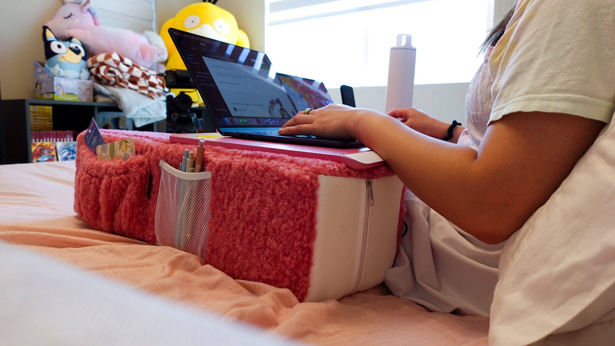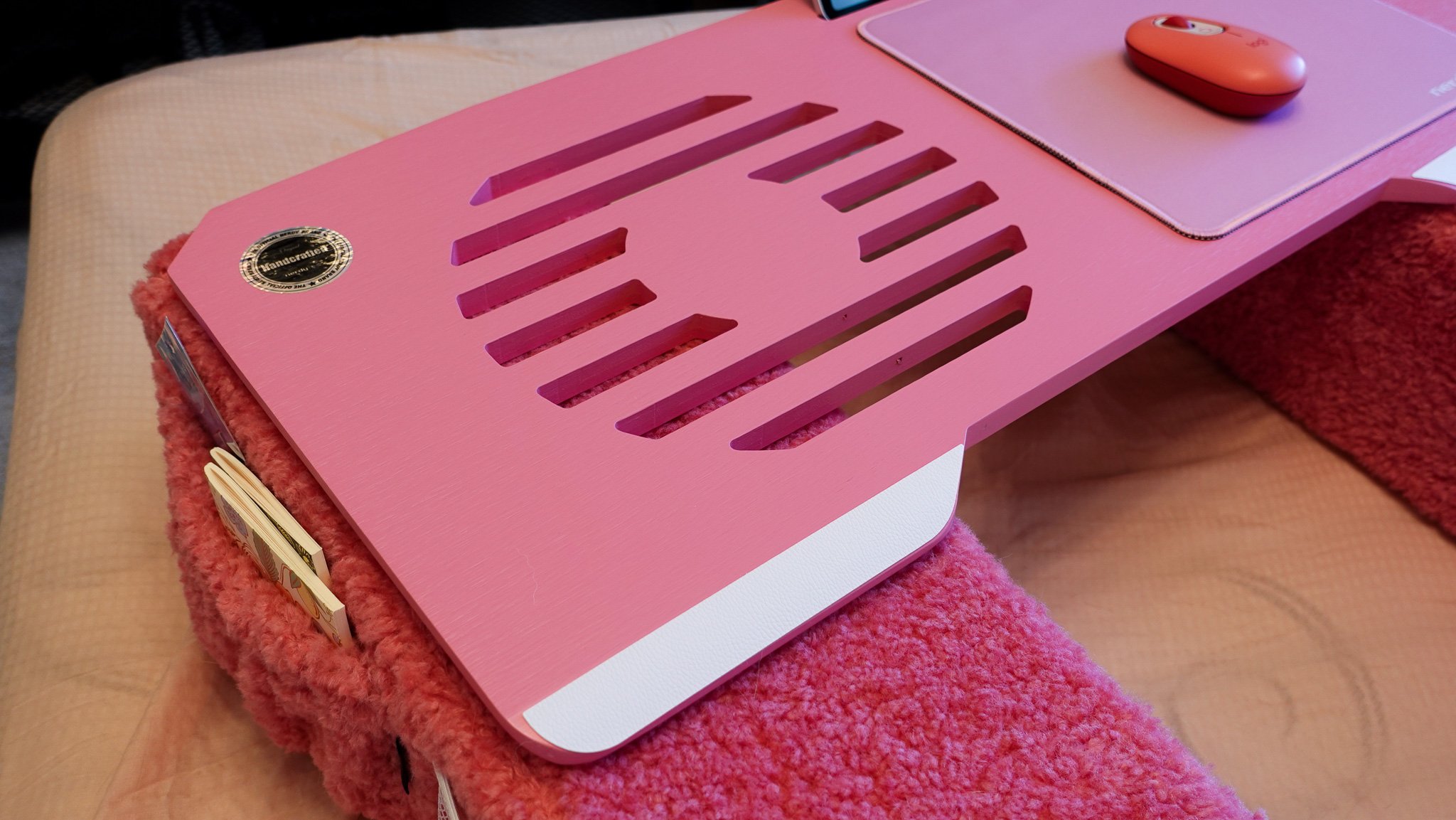 Each side has different pockets for accessories including a mouse bag, a side bag for accessories, and a netted pocket for other small items. The cushion material consists of memory foam inside and is lightweight to maneuver around and store. The cushions can be removed from the casing and are machine washable. Then there’s the actual desk itself which is of course, also pink and made from sustainable bamboo. There’s a grill cut onto the wood to give your device cooling ventilation space, but half of it is blocked by the cushion it rests on so the design isn’t exactly perfect there.
