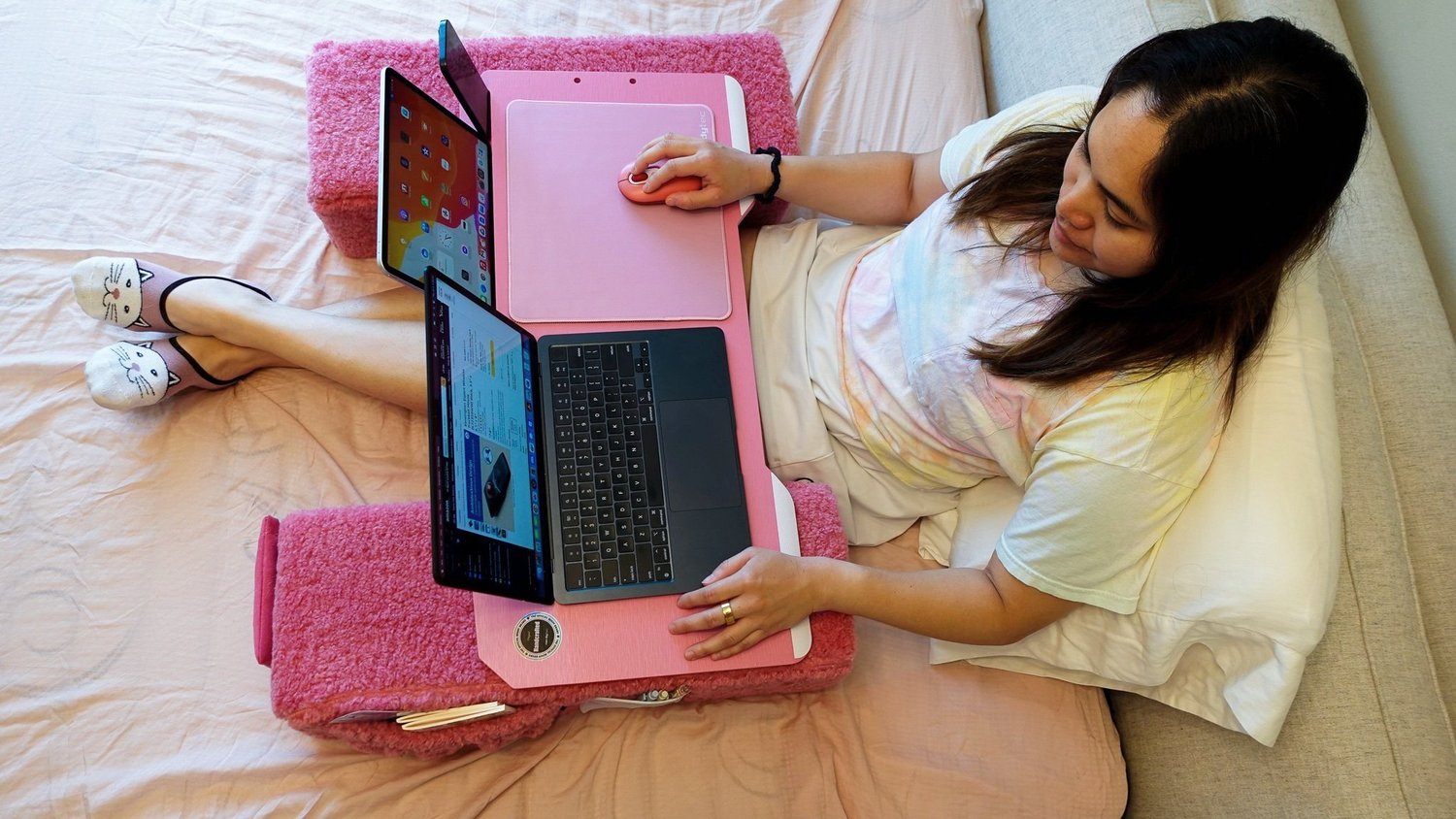 As much as I enjoy my desk setup, there’s something to be said about wrapping up your evening in bed with a laptop or tablet. To this day, I still enjoy watching shows and movies from the comfort of my laptop in bed or on the couch as opposed to a large screen TV. Enter the Couchmaster CYPINK from Nerdytec. With this ingenious invention, I theoretically should be able to conquer my bed and/or couch to make it the most luxurious workspace known to humankind. Right?