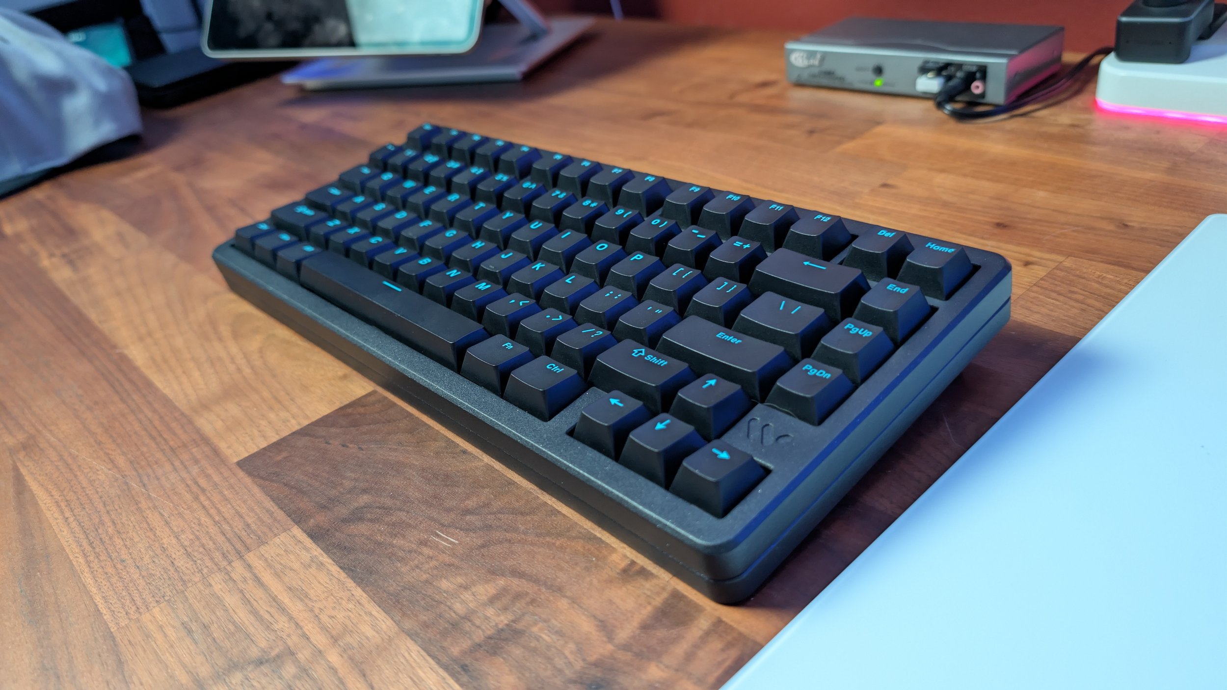 As is with many keyboard names nowadays, the SK75 TMR model name represents the size of the mechanical keyboard and the HE added to listings identifies the Hall Effect nature of the unit. As a 75% board, the SK75 TMR has 81 keys that include a column on the right side for Home, End, PgUp, and PgDown. There isn’t a gap between those additional keys and the main layout, but I do find this compact keyboard to be well spaced out and evenly sorted.