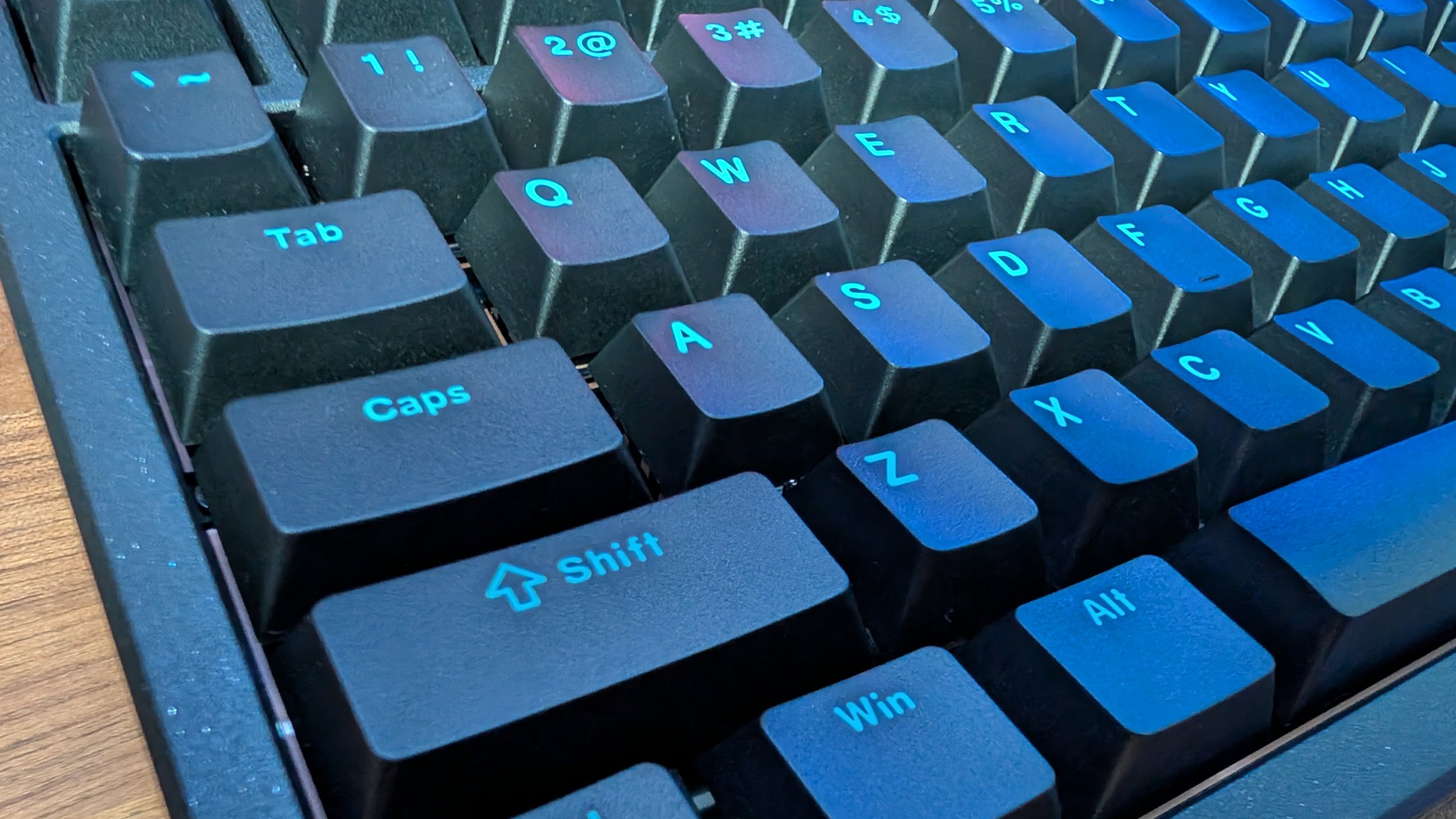 As for the feel of the double shot keycaps, the PBT cherry profile set here isn’t bad for an included choice. I have the black offering with turquoise colored symbology, and like the rest of the keyboard, they’re just straight up a black color with no deviations. It’s a little plain, but there are fans of a minimalistic clean look like this and I’m all for it. While the symbology of the keycaps aren’t pass-through, the south-facing RGB has a nice diffused look seeking around the keycaps. I do think it looks nice and while the preset RGB backlight modes are basic in nature, it works well for this keyboard’s aesthetics.