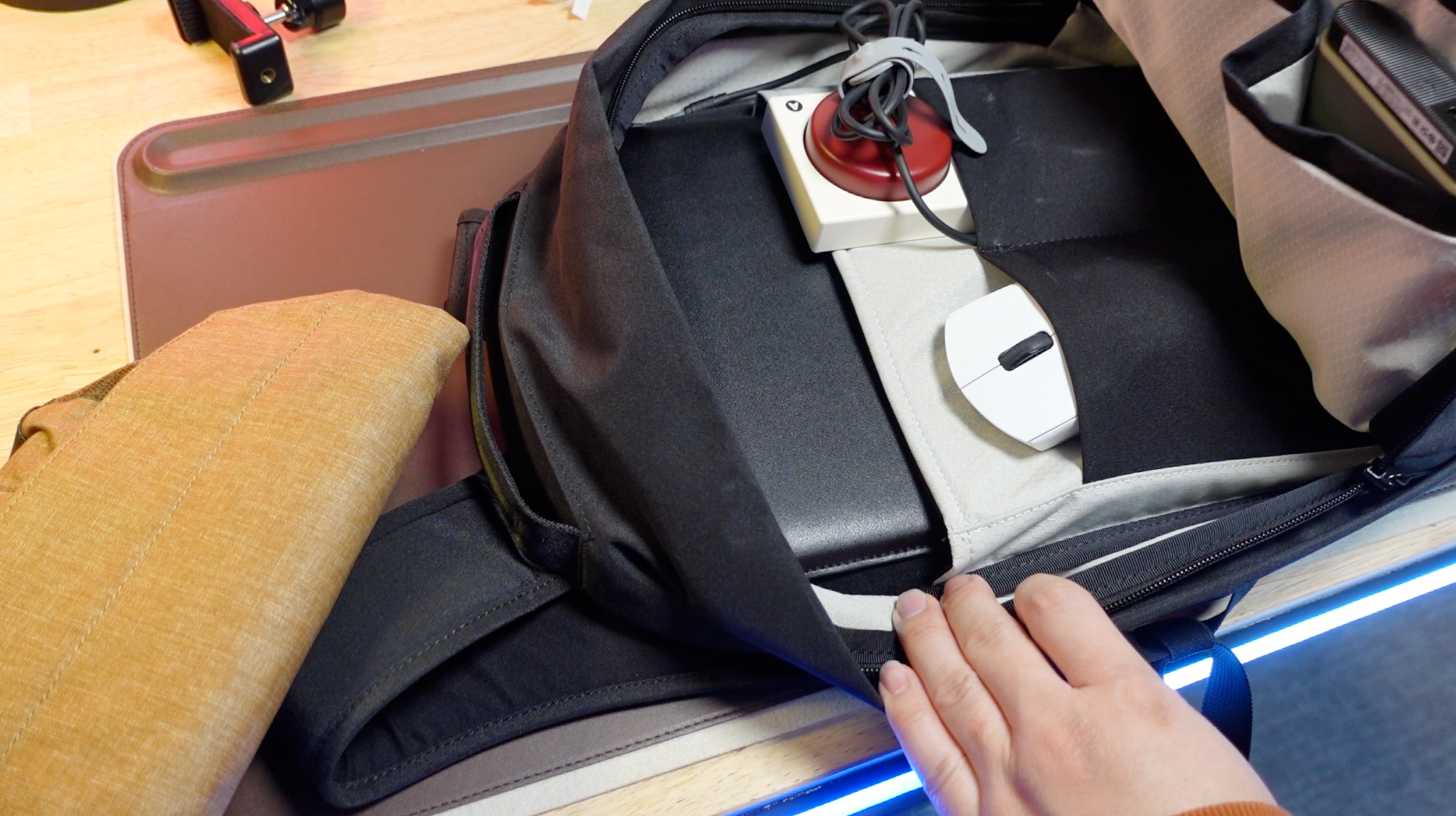 Let’s get this out of the way, the 12L of this backpack is really tight. Measuring at 16.5”x9.8”x6.1” the pebble-like oval shape of the form factor really limits the things you can squeeze into the bag. Part of what makes this bag look so attractive on the outside is due to the round shape it’s constructed in though so I can’t complain too much about this. While the company says you can fit a 14-inch MacBook Pro into the laptop slot (which you absolutely can), it’s essentially a perfect fit with a thin laptop sleeve wrapped around it that doesn’t leave a lot of wiggle room. Speaking of the laptop slot, it’s located inside the main zippered compartment of the bag. There’s no concealed back zipper slot or any special storage space dedicated to a laptop on this design. Compact bags usually are designed this way and that means the laptop will take a decent chunk of the interior storage that the Metro offers. Fortunately it does a great job of tucking it away using a terrifically stitched honeycomb mesh pocket that has the inner lined with a soft touch material to protect the computing device.