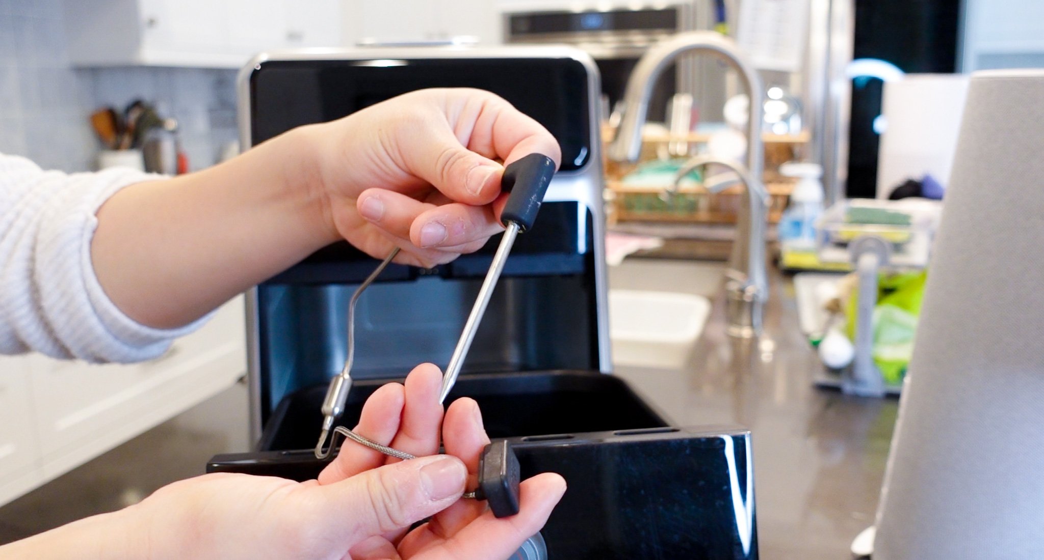 The ChefMaker comes with some accessories that I use all the time to cook my meals. There’s a cook probe that can be used when users want exact temperature sensor measurements. This magnetically locks into the basket and can easily be removed as well. There’s also a cooking tray and a grilling rack included in the set. All pieces are dishwasher safe with the exception of the cook probe and the unit shell itself. There’s also a small water tank at the top of the unit that is detachable and can be used when adding steam to foods. The ChefMaker has a temperature range of 100℉ - 450℉.