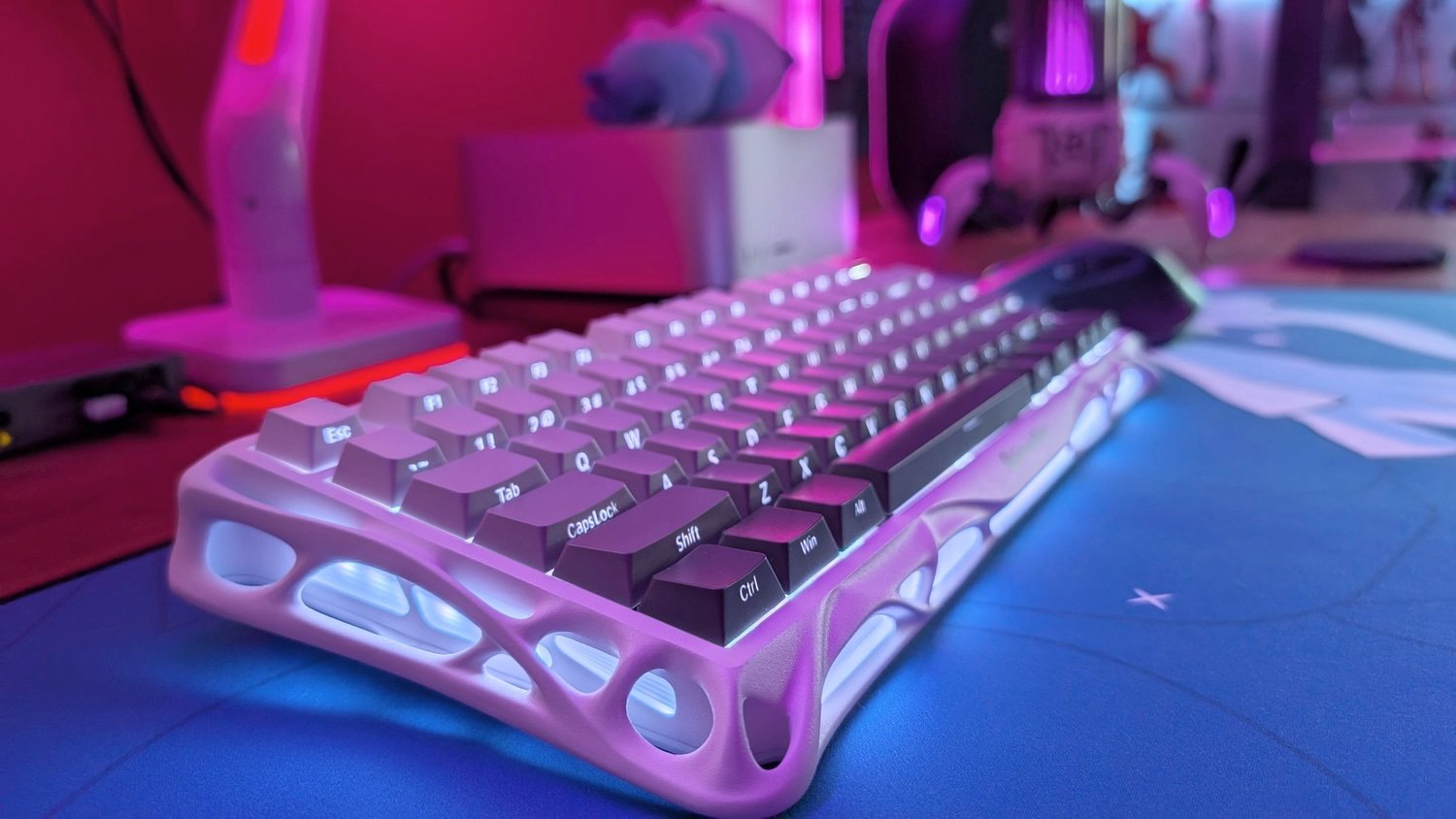 The top side, which you spend most of the time looking at, is interesting to say the least. Dell has an Alienware line, but GravaStar has out-aliened Dell with the Mercury K1. The webbed-through holes along the frame of the board is accented by diffused RGB strips. It looks like some sort of alien spacecraft design. The gradient white version of this board that we were sent looks stunningly clean and outer worldly. The matte white finish feels nice to touch and doesn’t absorb fingerprints either. I personally find the board to be appealing to look at as well as to touch with my fingers.