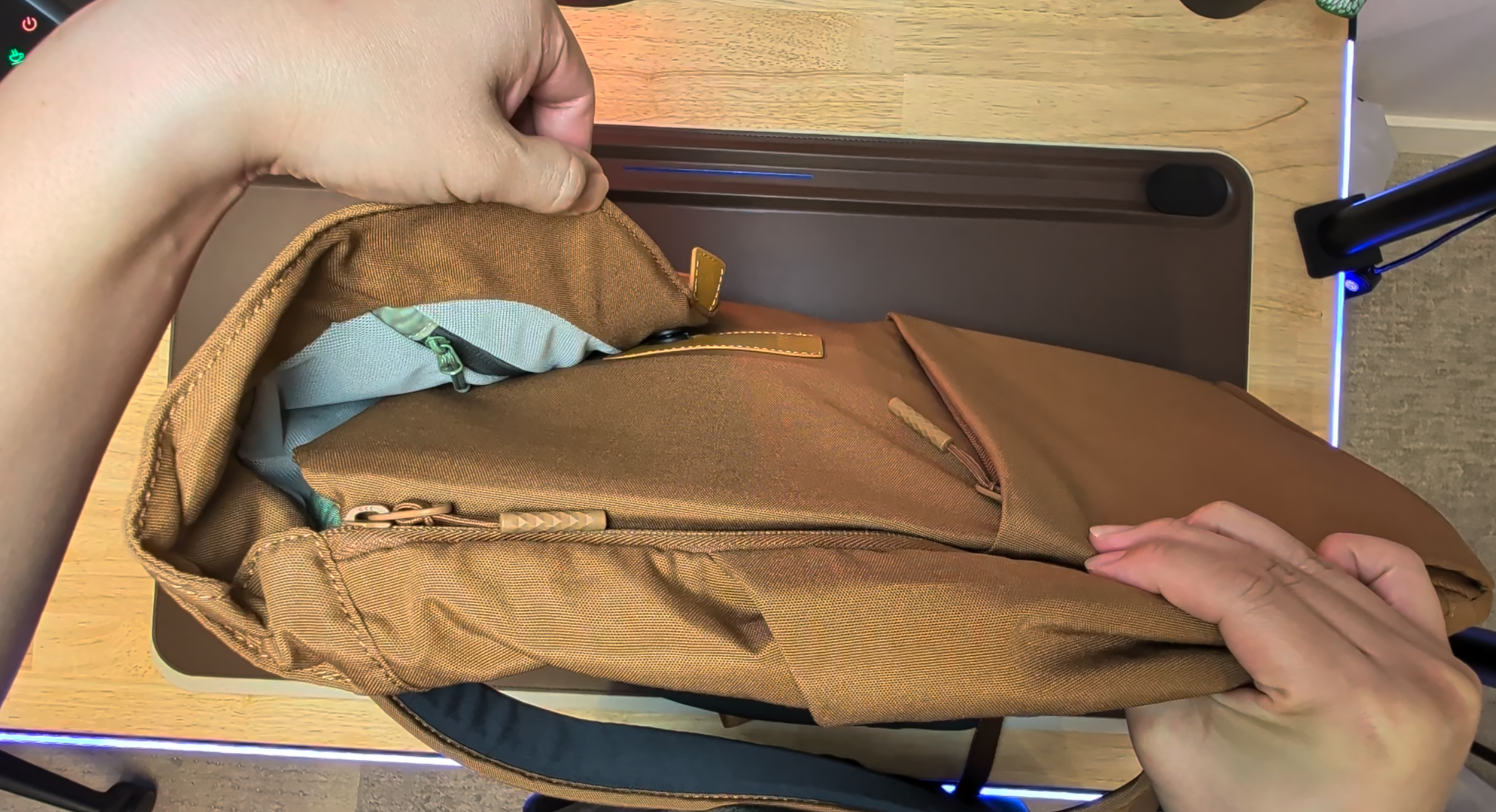 From a physical design standpoint, I’d say the backpack can carry a decent amount of daily gear. I was able to load in a few small Amazon packages from the office to carry home using this bag. Made out of a recycled polyester material that feels neither cheap nor expensive, it does repel drops of water landing on the fabric. The material is coarse and I didn’t particularly like the stitching across the plane, but it's an eco-friendly build that didn’t discolor or scratch up over the last few months I’ve worn it.