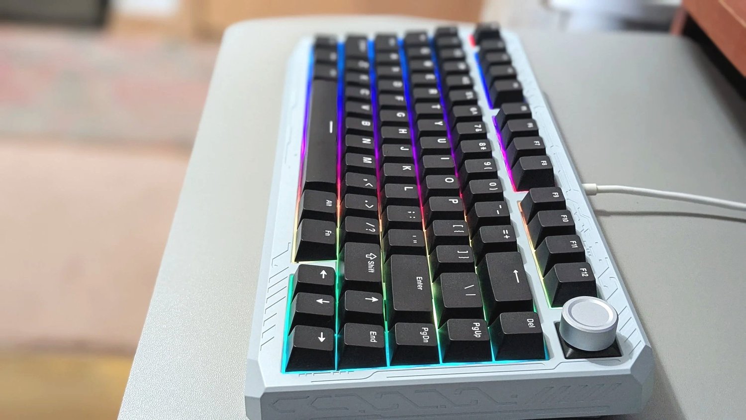 Though the look of this board doesn’t appeal to me at all, the overall experience of using it was so good that it has actually become one of my favorite keyboards I’ve tried. Looks aside, this keyboard is almost everything I’ve been wanting in a keyboard. I have a small desk, so I appreciate compact boards, but I often prefer the 98% form factors more because I tend to miss some of the keys. Though I do like a numberpad, I feel like I haven’t missed it that much with this keyboard. The ERA75 still has all of the keys I need. I love that it retains the F keys, and even has a few extra keys on the right-hand side (del, pg up, pg dn, end). On top of that, it has a volume wheel! Finally! I’ve tried a fair handful of these compact boards, and they either don’t have a volume wheel or they’re lacking something else (like the F keys), so even if I like them, they’re not quite perfect for my needs. The ERA75 having both is a real win for me.